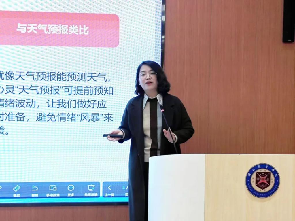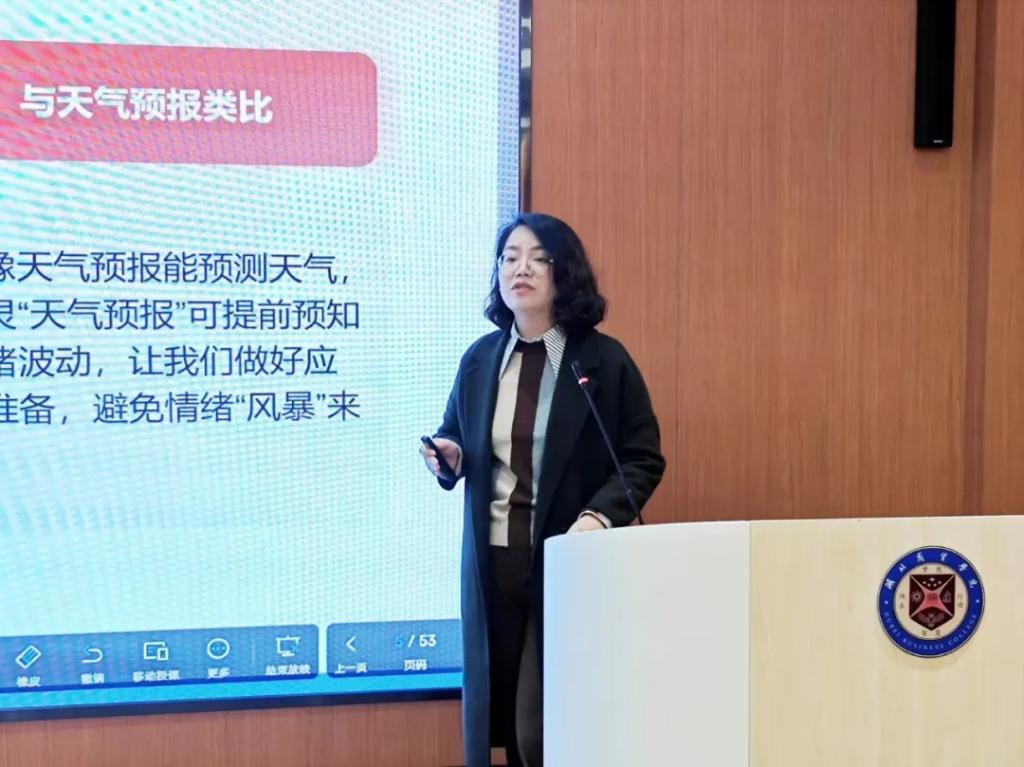 “每个人的内心都有一片天空,时而万里晴空,时而风雨交加。”讲座从“情商与人生”的话题切入,王祥君将现代心理学与中国传统智慧相融合,提出“心灵气象学”这一生动概念——正如我们学习观察自然天气,亦可修炼觉察内心阴晴的能力。她指出“真正的天气预报员,不是为了改变天气,而是学会在每一种天气里,都与自己温柔相处。”,情绪就像天气,时而晴朗,时而有雨,如果我们能学会觉察情绪的变化、理解情绪的规律,就能更好地在情绪波动中保持内在平衡,增强心理韧性。