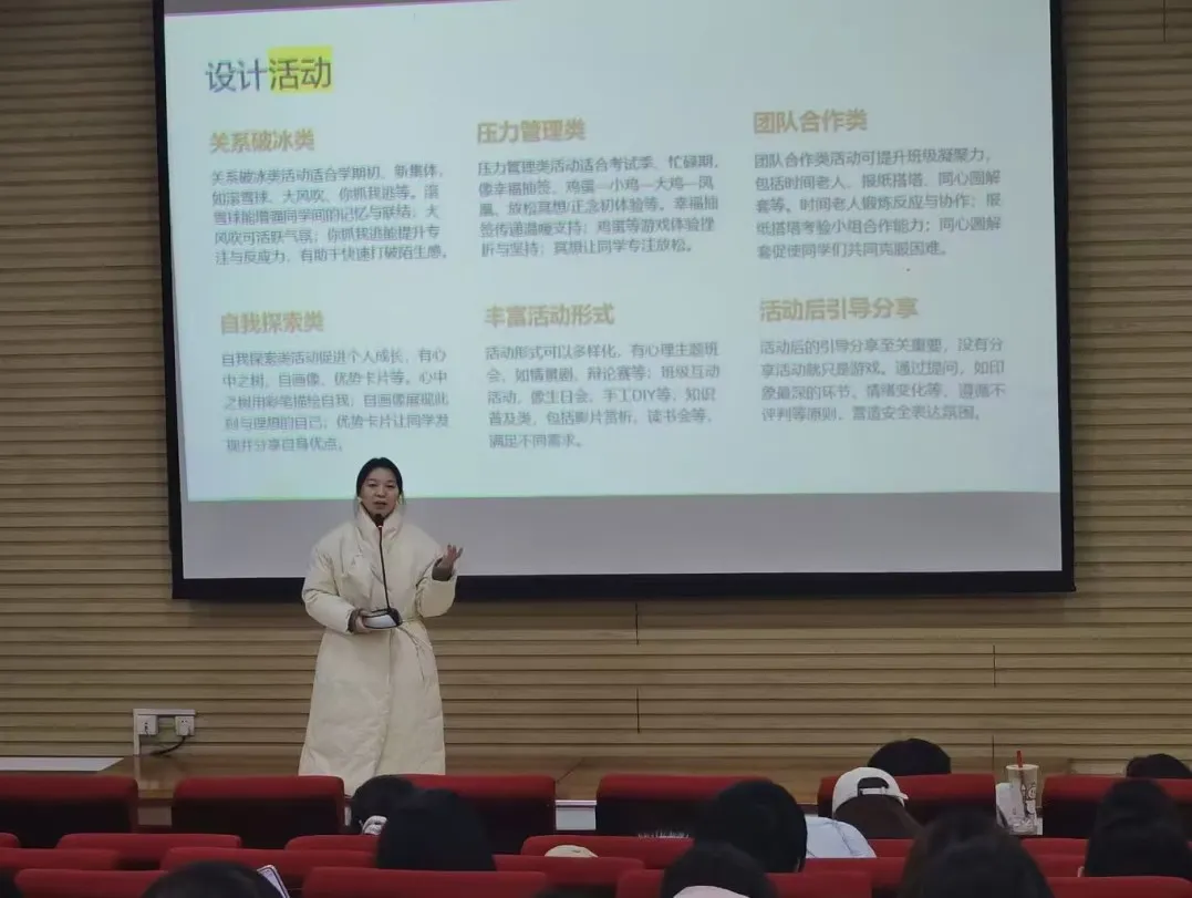 讲座开始,贾海灵澄清了一个常见误区——心理活动不等于心理治疗,更不是少数人的专属。班级心理活动更像是“心灵健身操”,面向全体同学,旨在提升心理素质、促进个人发展、增强班级凝聚力。一次好的班级心理活动,能帮助大家更好地管理情绪、改善人际关系、进行自我探索;最重要的价值在于营造一个安全、包容、支持性的班级环境,让每位同学都能感受到归属与温暖。“重体验,轻说教”是班级心理活动的核心理念,她强调,活动会让同学们在亲身参与中感受成长,营造安全包容的互动氛围。