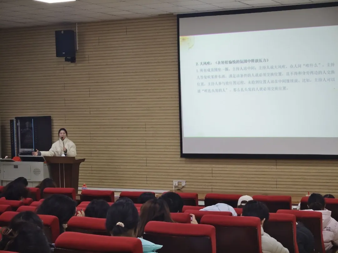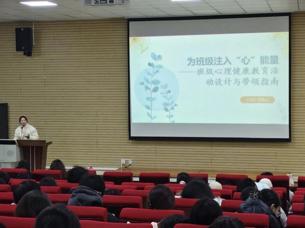 为营造积极的校园心理氛围,赋能班级心理健康教育建设,2025年12月24日晚,由学生工作部(处)心理健康教育中心主办的第105期“心语讲坛”在咸宁校区教学楼A108顺利举行。本期讲座由学生工作部(处)心理健康教育中心教师贾海灵主讲,以“为班级注入‘心’能量”为主题,聚焦于如何设计与开展班级心理健康教育活动,吸引了众多对心理健康和班级建设感兴趣的同学参与。